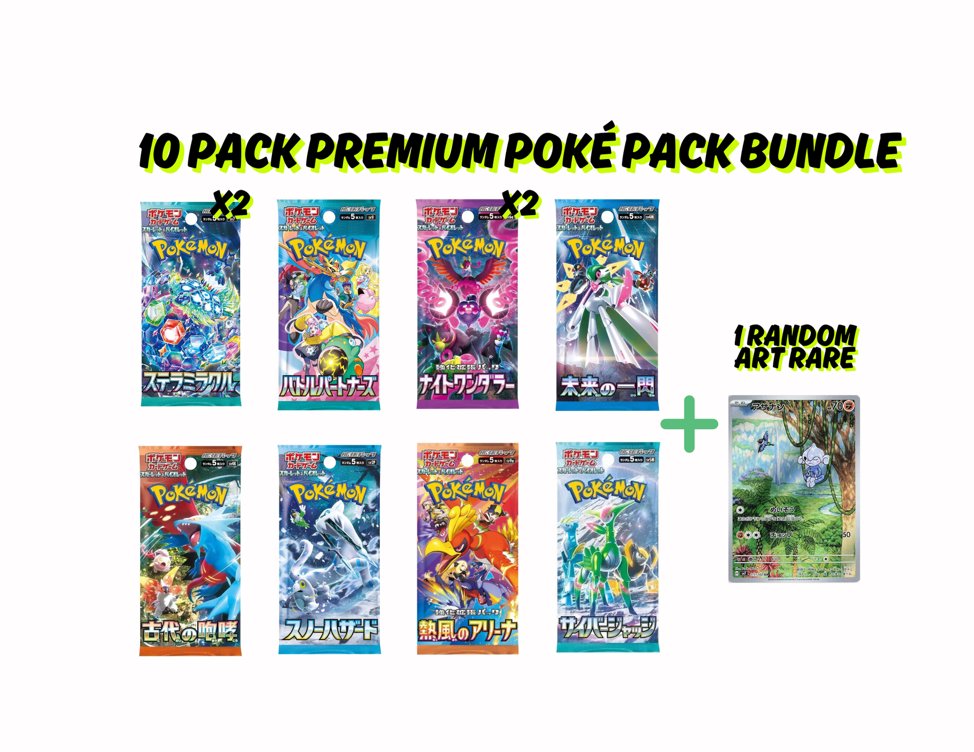 Elevate your Pokémon card collection with the Poké Pack Bundle – an exclusive selection of Japanese booster packs designed for collectors and players! This premium bundle includes 10 Japanese booster packs all from the Scarlet & Violet era up to Heat Wave Arena (Hot Air Arena), featuring some of the most sought-after and rare sets. With this bundle, you’ll have the chance to chase top hits and rare pulls from across the entire S&V era!